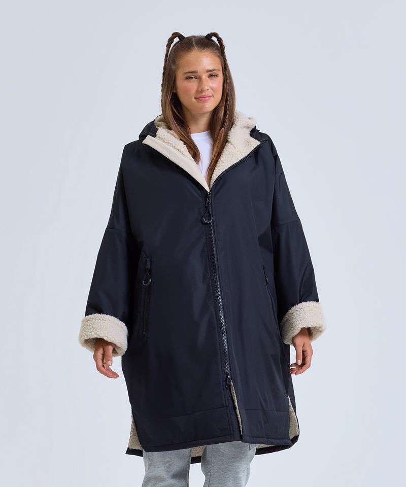Unisex. Oversized. Full-length two-way plastic zip with easy pull toggles. Chin guard. Oversized fit. Side vents. Adjustable cuffs with hook and loop fastening. Side zip pockets. Inside pocket with zip on the left side. Inside patch pocket on the right side. 3-panelled hood. Loop on the centre back of the jacket for hanging the robe. Dropped back hemline. (5000/5000 waterproof and windproof). Embroidery access to the back and chest area can be accessed through here. Waterproof taped seamed outer layer. Sherpa fleece interior. Rebrandable stuff sack carry bag with double drawstring straps. CE Class 1 Certified.